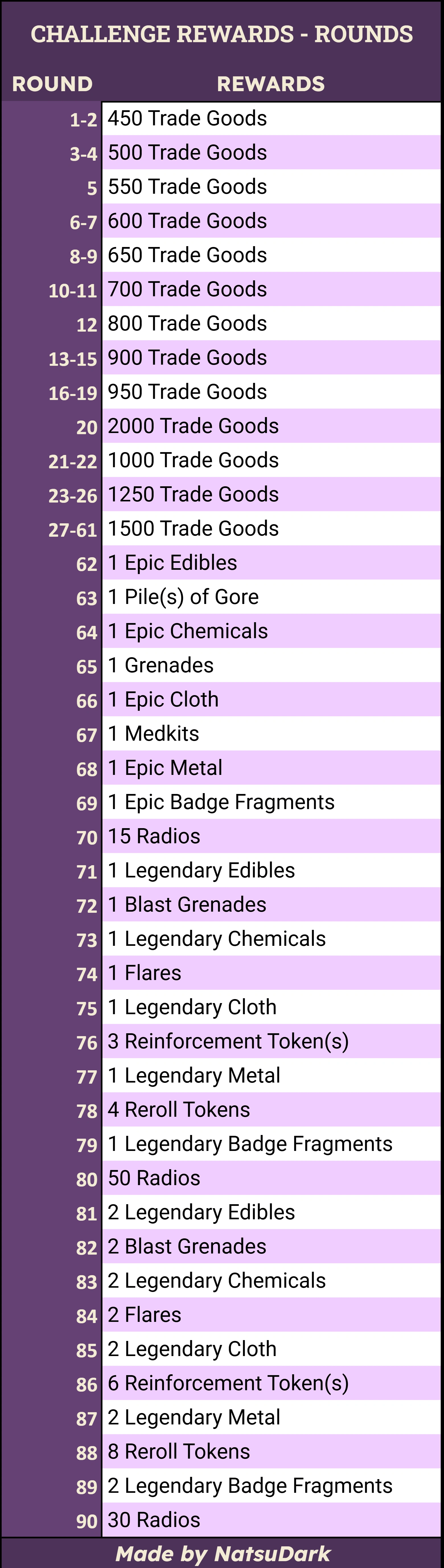 | Nightmare rounds | - | Always starts at Round 61 |