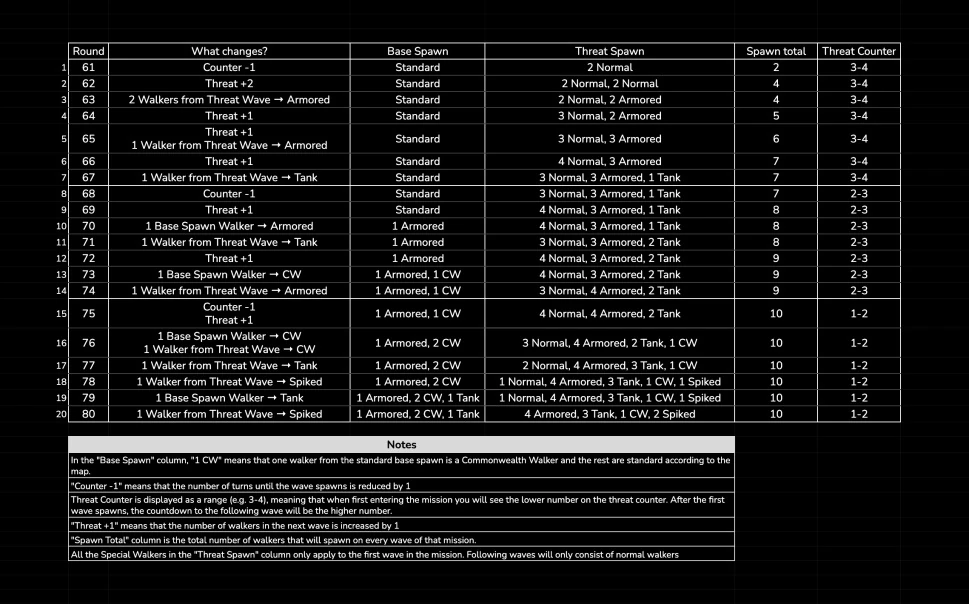 Once you reach round 61, the Nightmare Rounds start. During the Nightmare rounds, a progressively larger amount of regular walkers will be substituted for special walkers, and the threat counter will decrease in time and increase in amount, based on the below table: