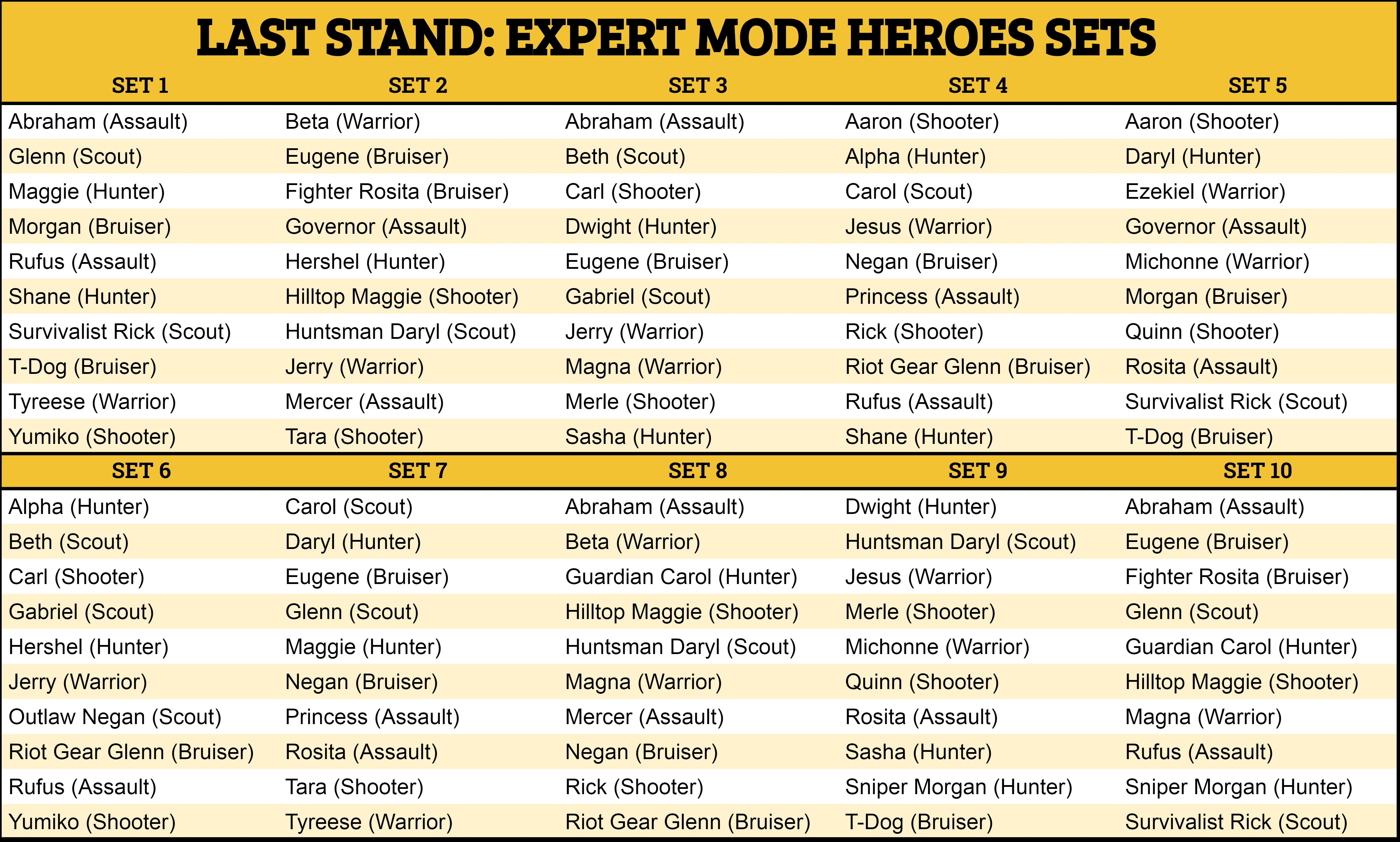 Expert mode features all regular survivors, and a pool of 10 Heroes from which you need to select your team members. The pool of Heroes is the same for all players, and refreshes weekly. The pool was changed on March 4 2024 and currently cosists of 10 different pools (note that set 1 is not in use) :