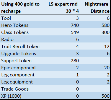 This table shows total rewards in average for 4 runs on Expert Mode in Last Stand to wave 30, compared to boosting the Nightmare Distance (each of which will cost 400 gold).